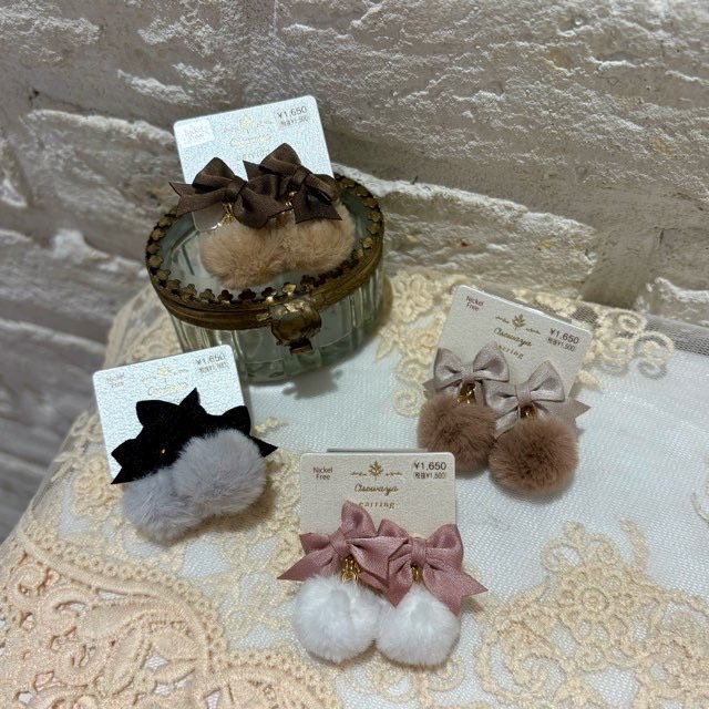 本日ご紹介するのは、ふわふわファーと可愛いリボンのイヤリングです!